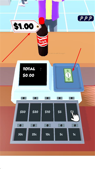 2、顧客購物時,看清商品價格如1美元汽水,接收對應金額紙幣,放入收銀盒。