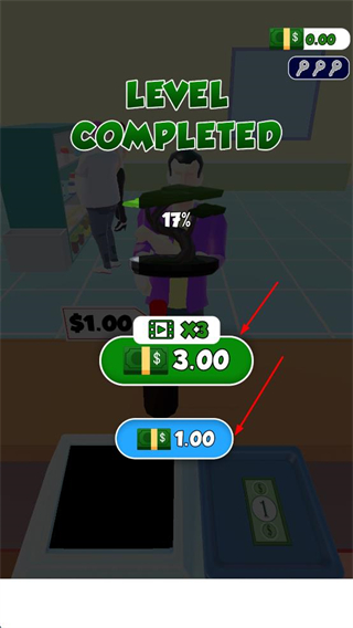 4、關卡完成后,選擇3美元獎勵收益更高,積累資金用于店鋪升級和擴張。