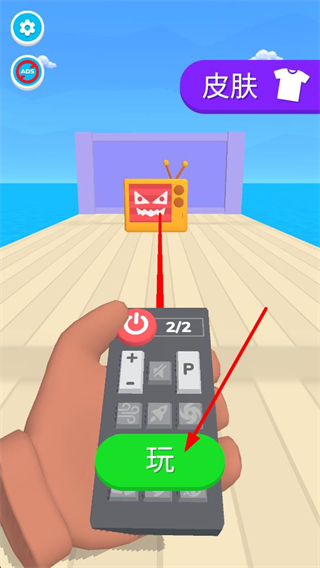 1、進入游戲看到帶有遙控器、電視怪的界面,點擊綠色玩按鈕,即可開啟操控遙控器的趣味挑戰。