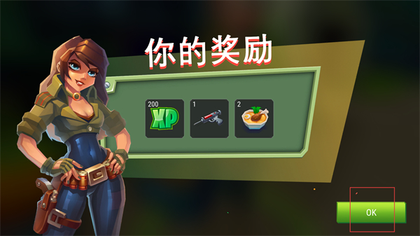 3、完成任務后,界面彈出獎勵窗口,包含經驗、武器和食物,點擊OK領取,積累資源提升生存與戰斗能力。