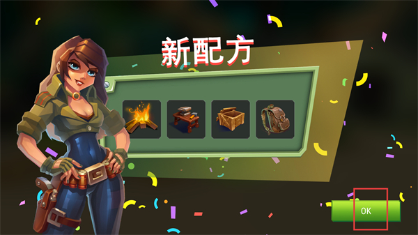 2、解鎖新配方可制作篝火、桌子、箱子、背包等物品,點擊OK確認,豐富生存工具,為搭建營地、存儲資源提供便利。