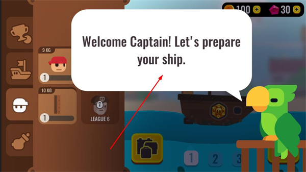 1、打開海盜戰爭游戲進入初始界面,查看鸚鵡的歡迎提示,明確需準備船只,點擊界面完成提示關閉,進入物資選擇頁面。