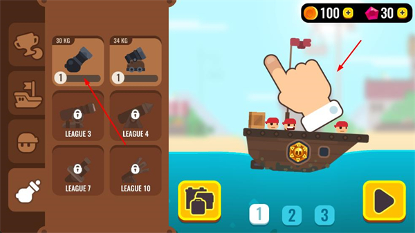 4、切換至武器物資欄,選擇火炮類裝備,將其添加到船只對應位置,完成武器配置后點擊開始按鈕啟動航行。