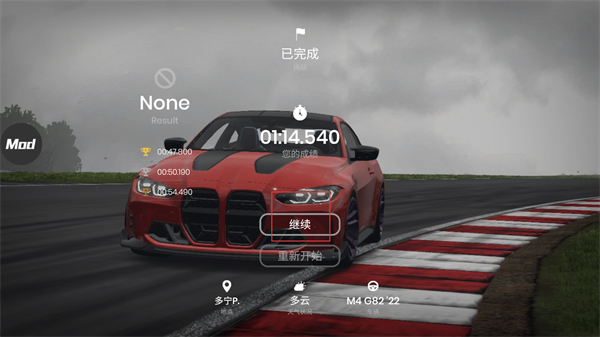 4、比賽結束后進入已完成界面,顯示賽事總時間,可選擇點擊繼續進入下一輪賽事,或選擇重新開始按鈕再次挑戰當前賽道。