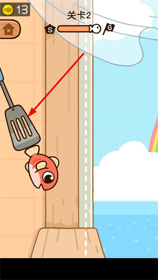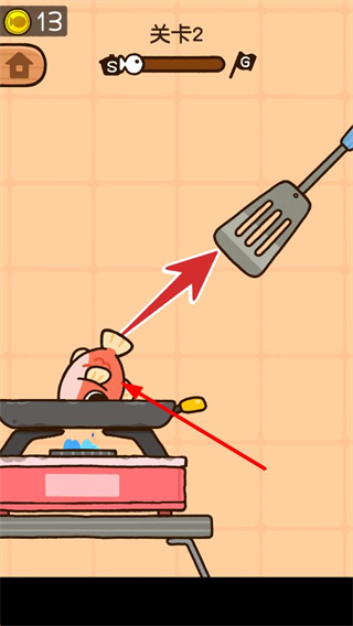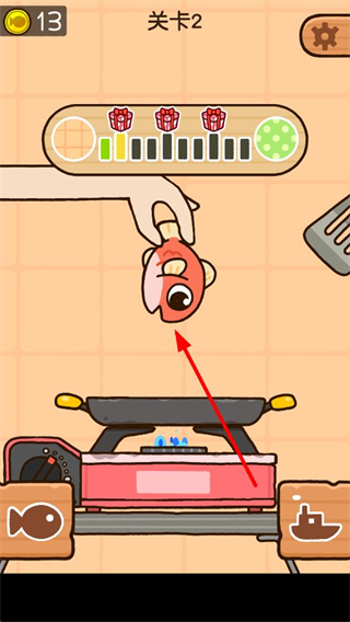 1、進入關卡2,看到金幣數量13,按照指引將魚放置到煎鍋處,然后開啟本關的冒險操作。