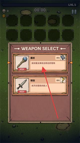 2、在武器選擇界面,挑選魔杖類武器,其可發射魔法彈攻擊附近怪物,適合應對多目標的關卡場景。