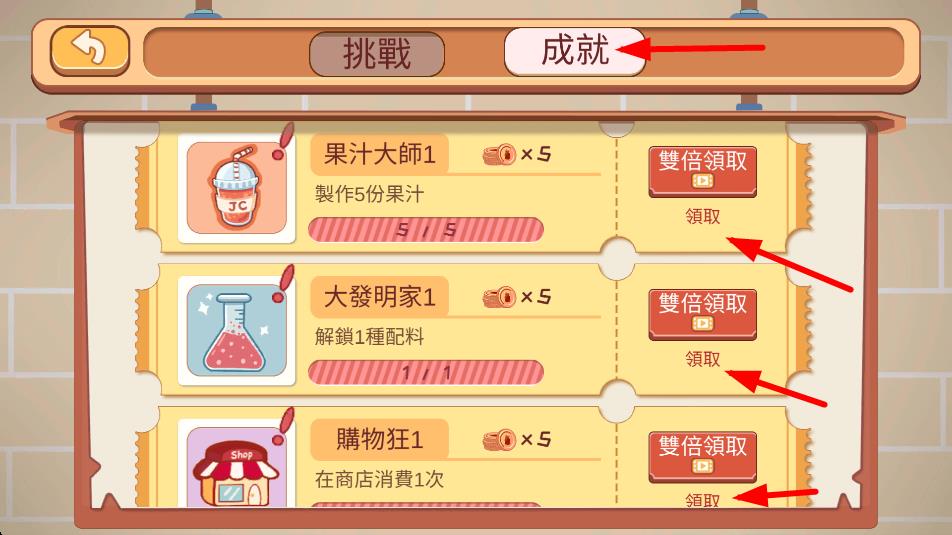 4、進入成就界面,查看已完成的成就任務,點擊領取按鈕,獲取對應的獎勵,積累經營資源。