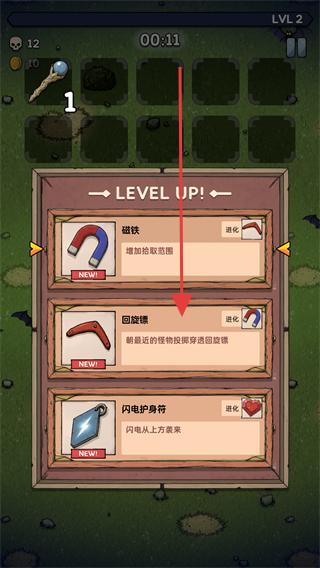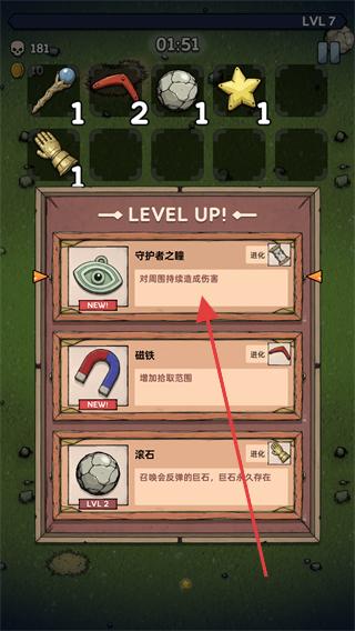 2、升級時選擇磁鐵類道具,其可增加拾取范圍,方便快速收集場景中的金幣,提升資源獲取效率。