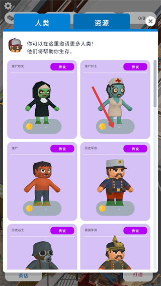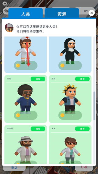2、在人類標簽下可招募不同職業的成員如保護護士,成員會協助完成生存任務,需消耗金幣解鎖以提升營地效率。