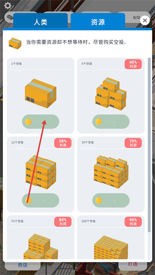 4、在資源標簽下可購買空投物資,這類資源包能快速補充材料,適合資源緊缺時使用,需根據需求選擇不同規模的空投。