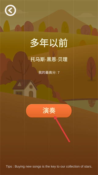 1、打開游戲選擇喜歡的曲目,點擊演奏按鈕進入彈奏環節,可查看該曲作者及個人最高得分,為彈奏做好準備。