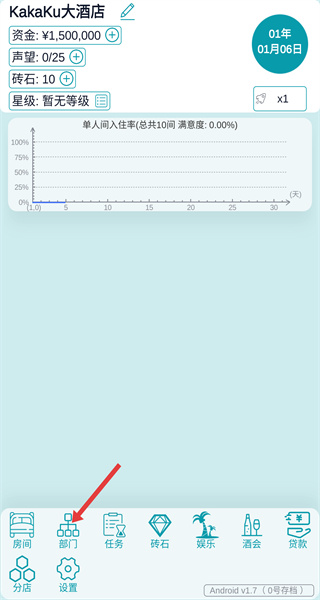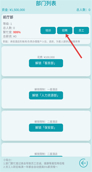2、在可看到已開啟的前廳部及其他待解鎖部門,后續可解鎖更多部門來完善酒店架構。
