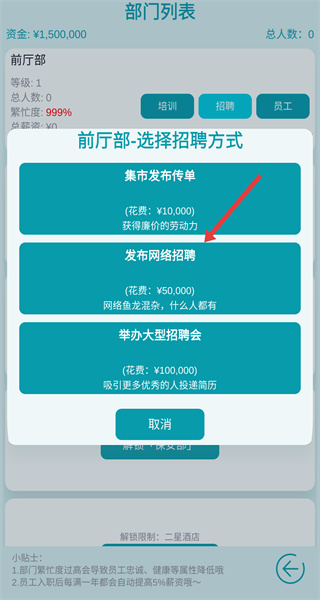 3、在部門列表的前廳部區域,點擊招聘按鈕,彈出招聘方式選擇界面,不同方式花費不同,對應獲得的員工類型也有差異,可按需選擇。