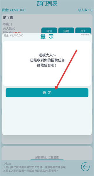 4、選擇合適的招聘方式后,系統會扣除相應資金并提示已接收招聘任務,此時點擊確定按鈕,完成招聘操作的流程,等待員工應聘結果。
