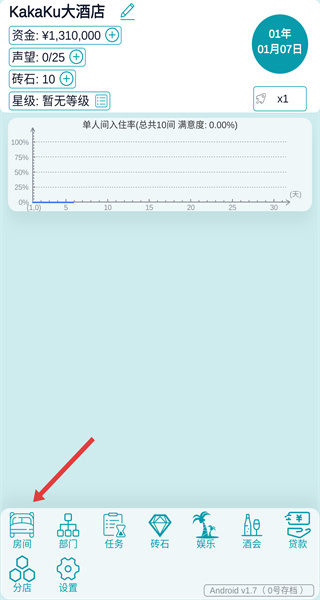1、先在酒店主界面找到并點擊房間按鈕,進入房間列表頁面,能看到當前擁有的房間類型。