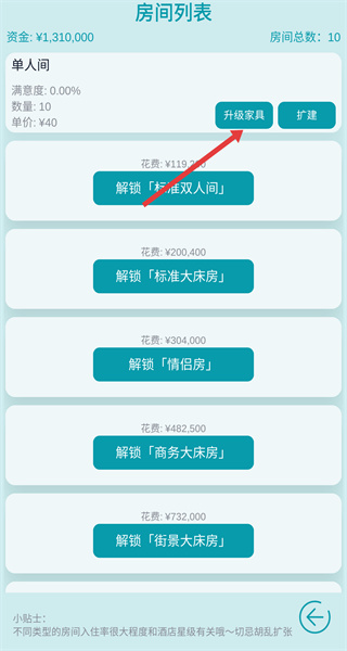 2、在房間列表里找到單人間對應的升級家具按鈕,點擊該按鈕后,進入單人間的家具列表頁面,可看到各類家具的當前等級與升級所需的資金。