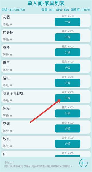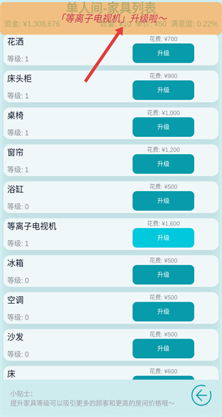 3、在單人間的家具列表中選擇想要升級的家具,比如等離子電視機,點擊其對應的升級按鈕,消耗對應資金來提升該家具的等級。