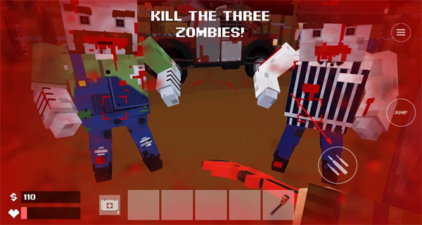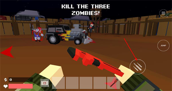 1、進入游戲后,界面顯示擊殺三個僵尸的目標,畫面里有載具和僵尸分布,點擊右側武器按鈕,準備攻擊場景內的僵尸。