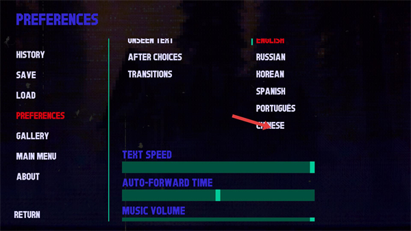 3、在偏好設置中選擇中文,將游戲語言切換為中文,便于更清晰地理解劇情與選項內容。