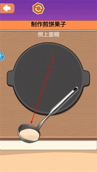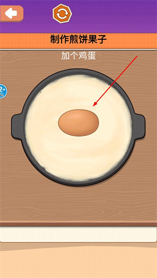 4、按照提示進行攤平雞蛋的操作使用工具將雞蛋攤開,完成該步驟,向制作完成煎餅果子推進。