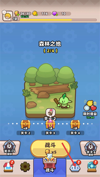 1、在世界地圖選擇關卡如森林之地,點擊陣容,進行升級后開啟挑戰關卡是獲取資源、推進游戲進度的核心途徑。