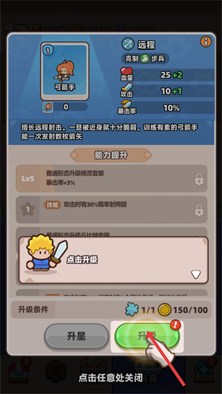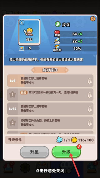 3、點擊升級強化兵種屬性,升級后會提升攻擊力、攻速等核心能力,同時解鎖新的技能如投擲,是增強戰斗實力的核心操作。