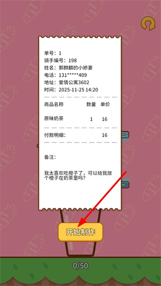 2、接到訂單后,查看訂單中的商品信息、備注要求,確認無誤后點擊開始制作,即可進入奶茶制作環節。
