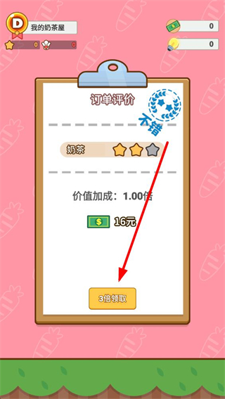 4、完成訂單制作后會獲得訂單評價,可選擇直接領取收益,也可選擇3倍領取來獲得更多獎勵,積累經營資源。