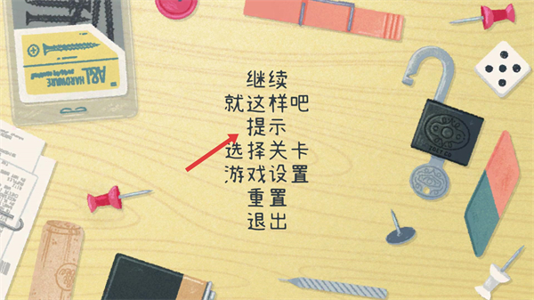 2、界面是游戲菜單頁,包含繼續、提示等選項,遇到解謎困難時可選擇【提示】獲取線索,根據需求操作來推進游戲進程。