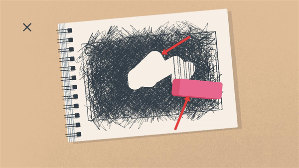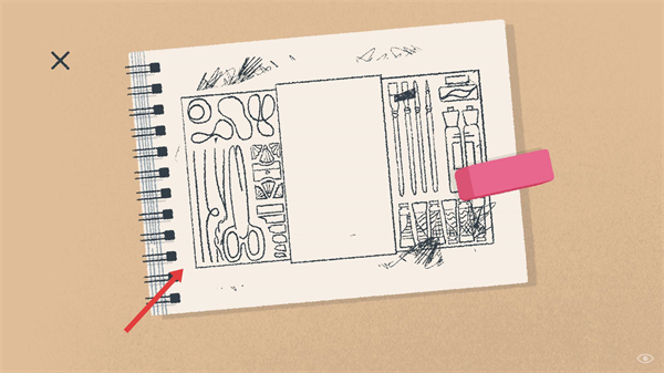 1、界面是文具類物品的散落場景,這是解謎關卡的初始界面,點擊右下角標志進行后續操作。