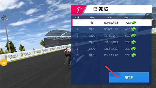 4、比賽結束后顯示排名與獎勵,點擊【繼續】按鈕返回準備頁,可用獎勵貨幣繼續升級賽車屬性,提升后續比賽的競速優勢。