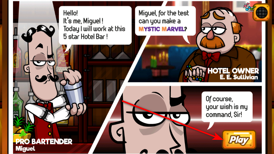 1、進入游戲后扮演調酒師,接到酒店老板的任務要調制一款特定飲品,確認需求后點擊開始按鈕就能開啟調酒流程,準備著手完成調酒任務。