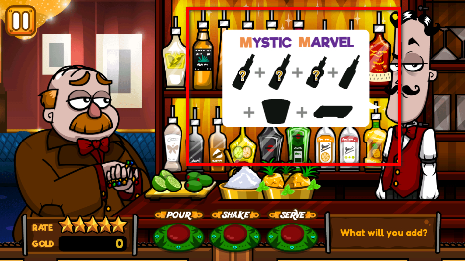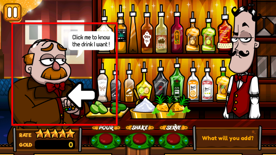2、點擊顧客了解其想要的飲品,再查看吧臺的酒瓶和配料,根據飲品配方挑選對應的材料,按步驟進行添加,備齊所需的調酒原料。