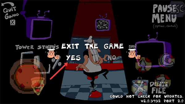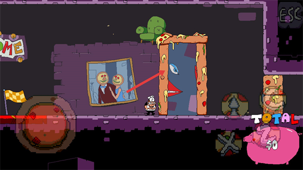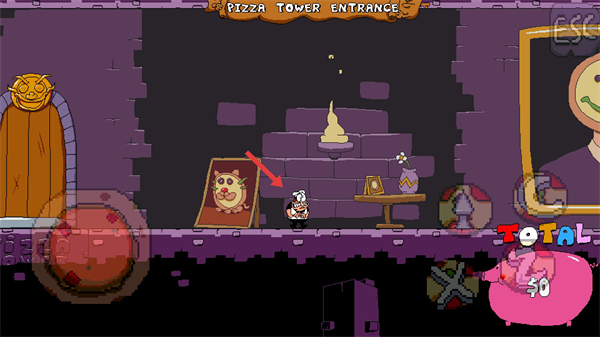 2、進入披薩塔入口場景后,操控角色移動,靠近墻上的畫作可觸發交互,這類元素可能隱藏關卡線索或道具,需逐一探索場景內的物品,推進關卡進程。