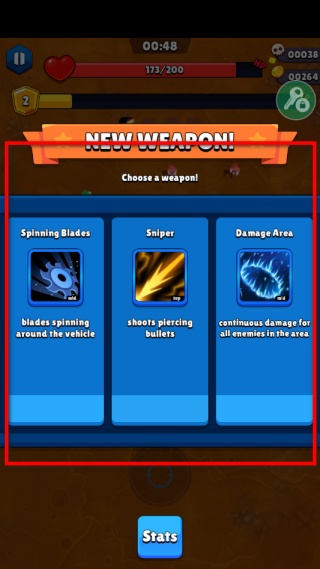 3、達成條件后會解鎖新武器選擇界面,可從旋轉刀刃狙擊槍區域傷害武器中選其一,不同武器對應不同戰斗效果,選后能提升戰車戰力。