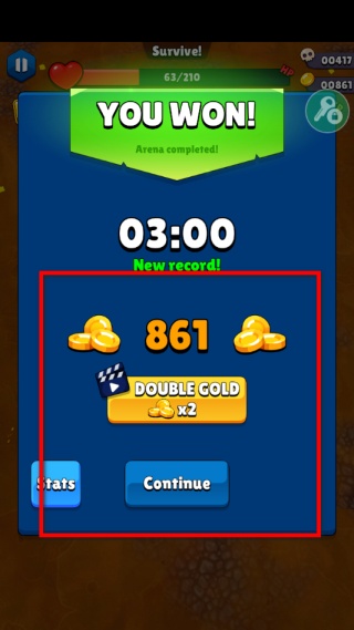 4、成功完成戰場挑戰后會顯示獲勝界面,可獲得金幣獎勵,點擊雙倍金幣按鈕能獲取更多資源,也可直接點擊繼續按鈕進入下一輪挑戰。