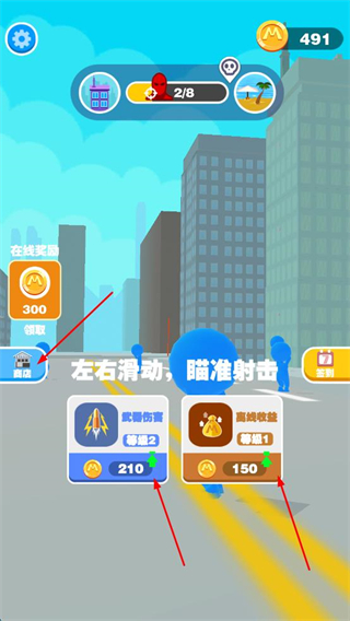 1、主界面左右滑動瞄準,選武器傷害、裝填收益技能,點擊領取在線獎勵,備足資源。