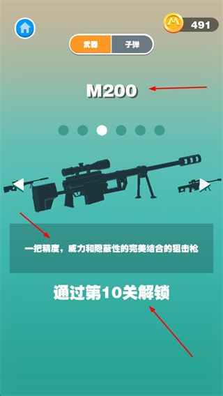 3、M200需過第10關解鎖,關注精度、威力、隱蔽性優勢,規劃闖關進度,優先解鎖強力槍。