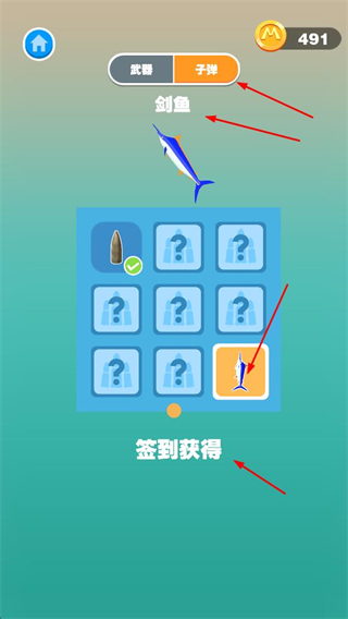 4、子彈頁劍魚簽到獲取,開啟問號格探索新彈藥,搭配對應槍械,提升射擊戰斗的多樣性。