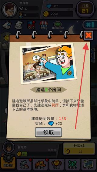 3、確認當前主線與建造房屋的需求,點擊右上角的關閉按鈕,進入避難所建設模式,確認可開拓的房間。