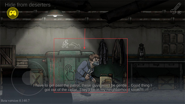 2、進入室內后,需隱藏自身以躲避巡邏者,按照指引蹲伏到垃圾桶等遮蔽物后,利用環境掩護避免被發現。