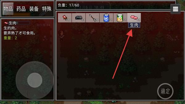 3、獲取生肉類物資后,需注意其需烹飪后食用,將物資存入物品欄,后續需找到烹飪設施進行加工。