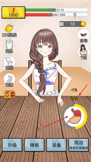 4、觀察胃部數值變化,適時升級、換裝備,挑戰10挑戰,積累金幣提升吃辣能力。