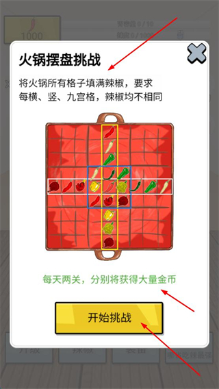 3、選火鍋擺盤,按數獨規則,讓橫豎九宮格辣椒不同,填完即可獲得金幣,每日兩關別錯過。