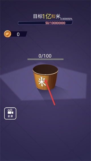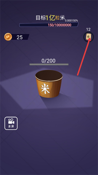 2、持續點擊米桶可推進米粒計數,目標為1億粒米,當前進度會同步顯示在頂部進度條中,需持續操作積累數量。