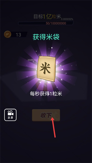 3、達成一定進度后可獲得米袋,點擊收下即可激活其效果——每秒自動獲得1粒米,這是開啟自動積累的關鍵道具。