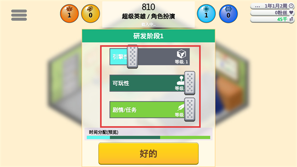 2、進入研發階段1界面,顯示810對應的超級英雄角色扮演項目,可調整引擎可玩性劇情任務的等級條,確認時間分配規劃后點擊好的,繼續游戲的開發進程。
