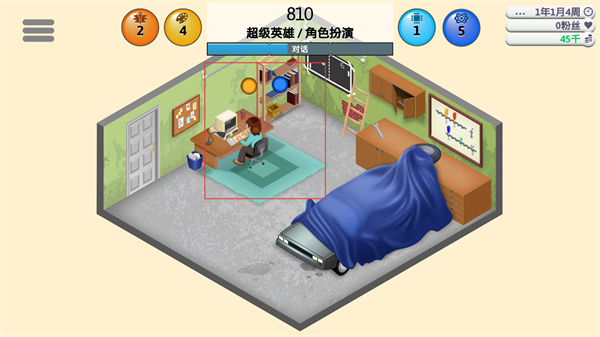 3、處于研發進行中的辦公室場景,界面顯示810對應的超級英雄角色扮演項目,可選擇對話進行交互,同時留意界面上的數值變化,推進當前的開發工作。