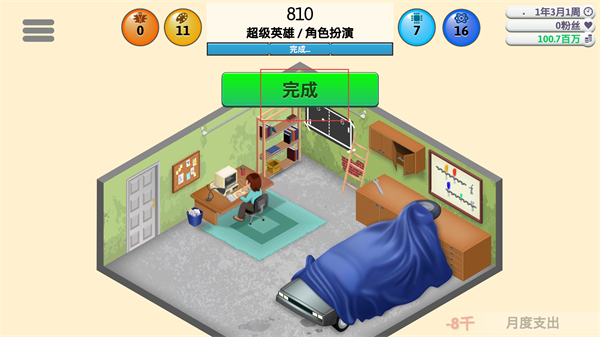 4、研發完成后進入對應界面,能看到綠色的完成按鈕及810對應的超級英雄角色扮演項目,同時留意月度支出等數據,結束本次的游戲開發流程。