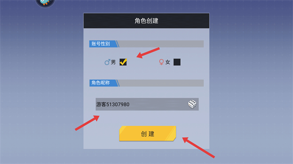 1、在角色創建界面選擇賬號性別,確認角色昵稱后點擊創建,即可生成角色進入游戲。